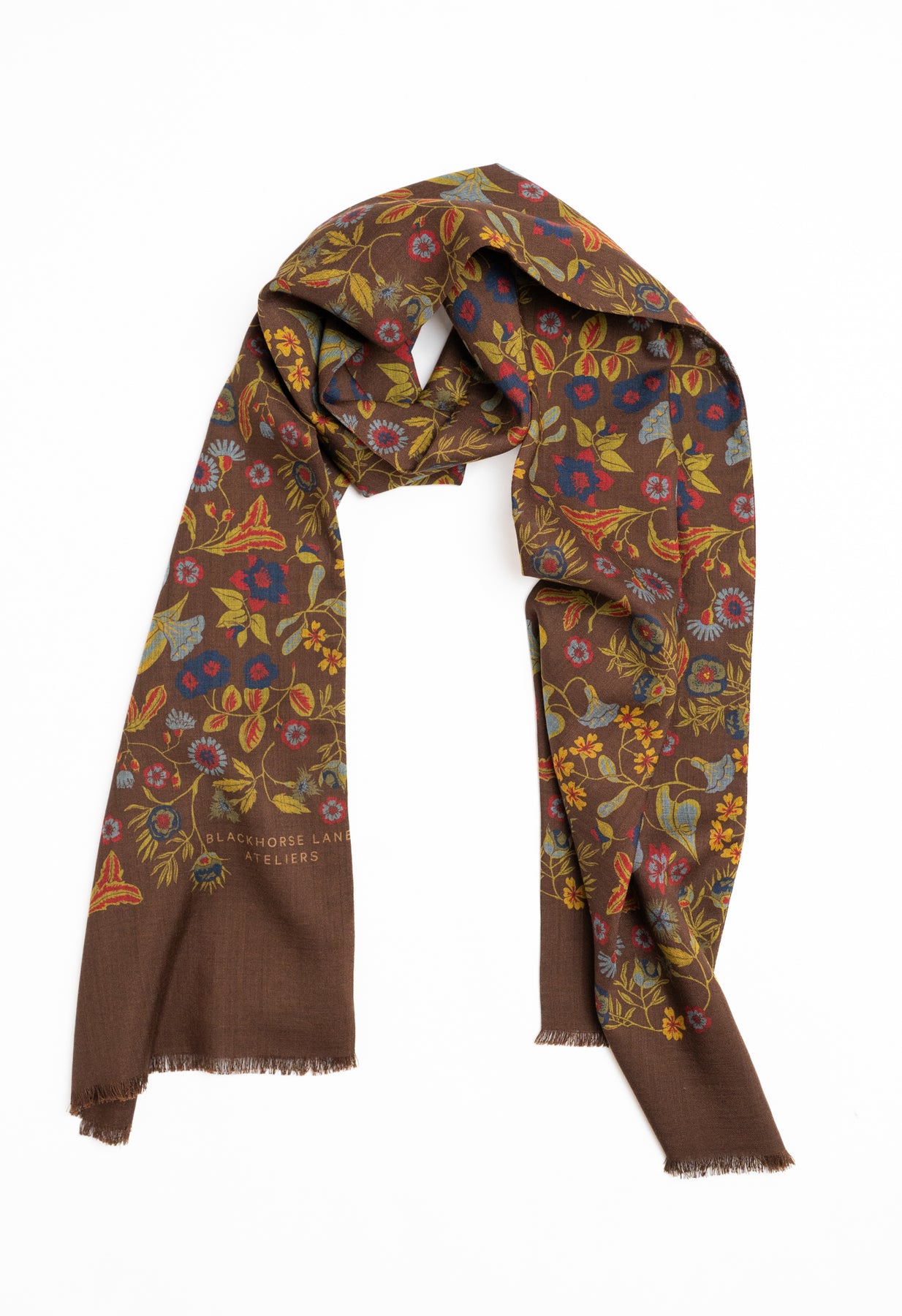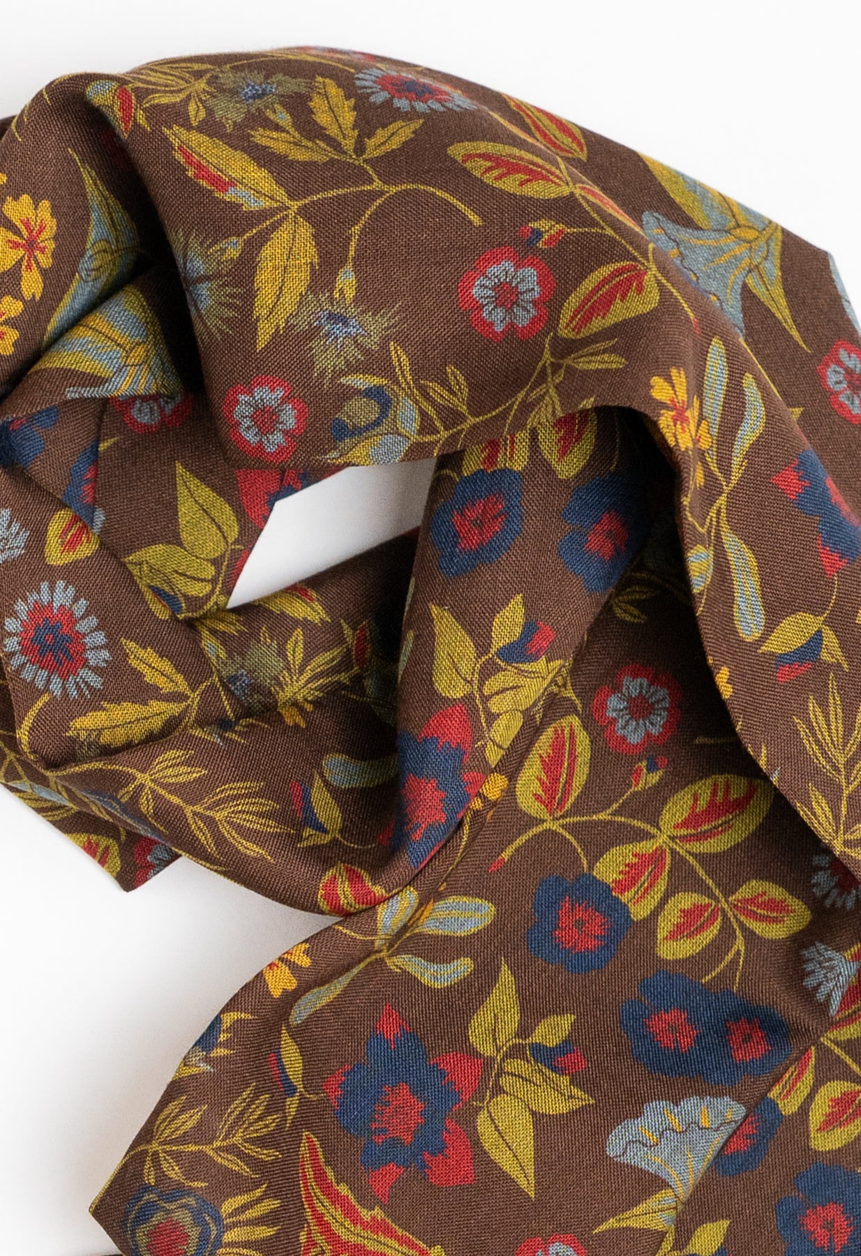 An elegant wool–silk scarf in a rich brown, decorated with vintage-inspired floral motifs. Printed in Macclesfield, England, a town long celebrated for its silk heritage, it’s a piece that brings equal parts character and refinement. Light yet warming, it’s the sort of accessory that slips easily into daily rotation once the temperature dips.