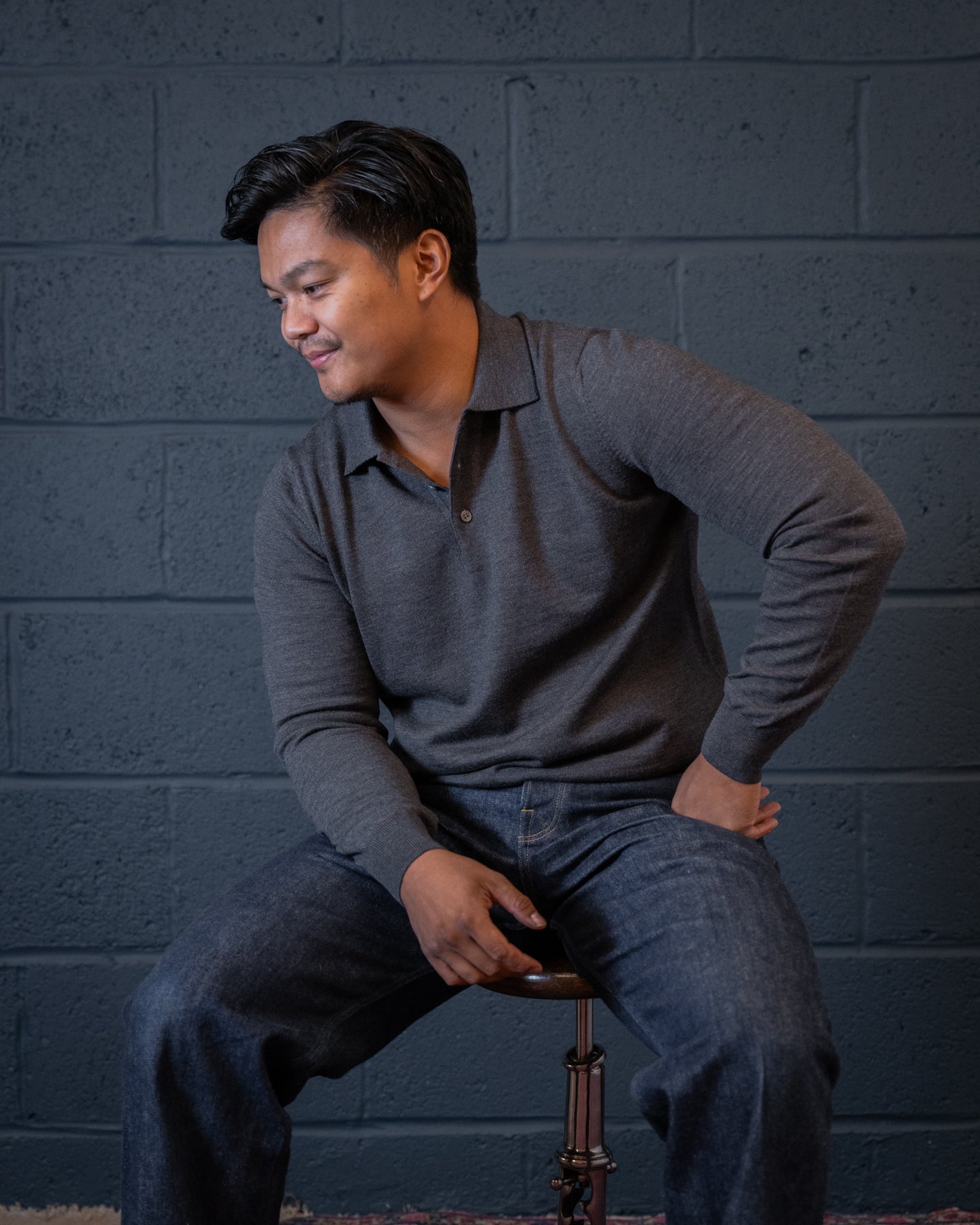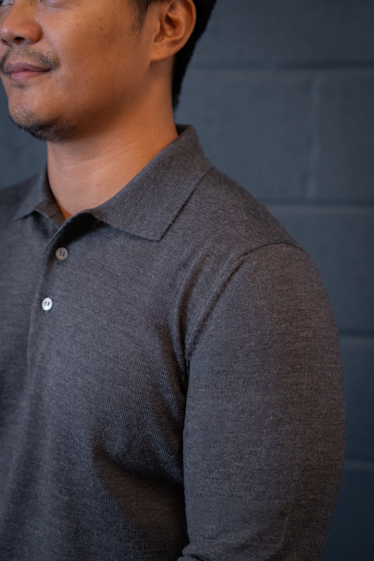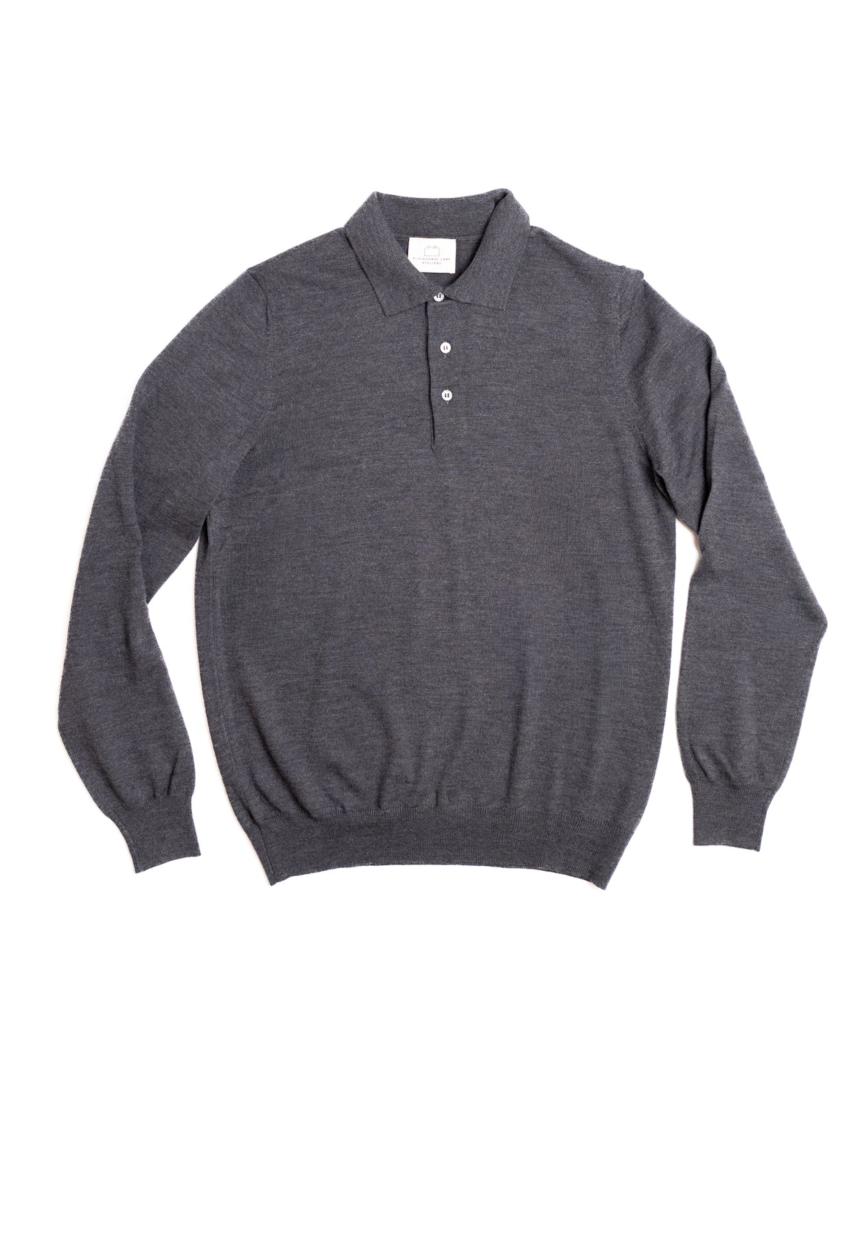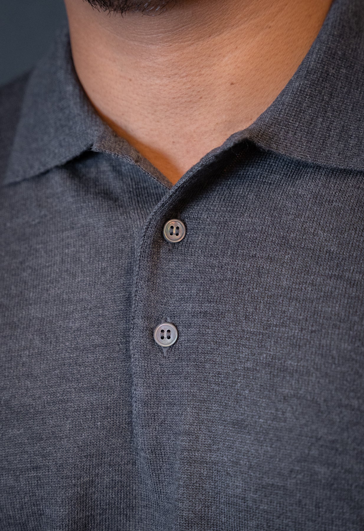 This grey polo is crafted from pure, extra-fine merino wool, offering a refined blend of elegance and versatility. With long sleeves and a classic polo collar, it works perfectly layered under a tailored blazer or worn on its own.