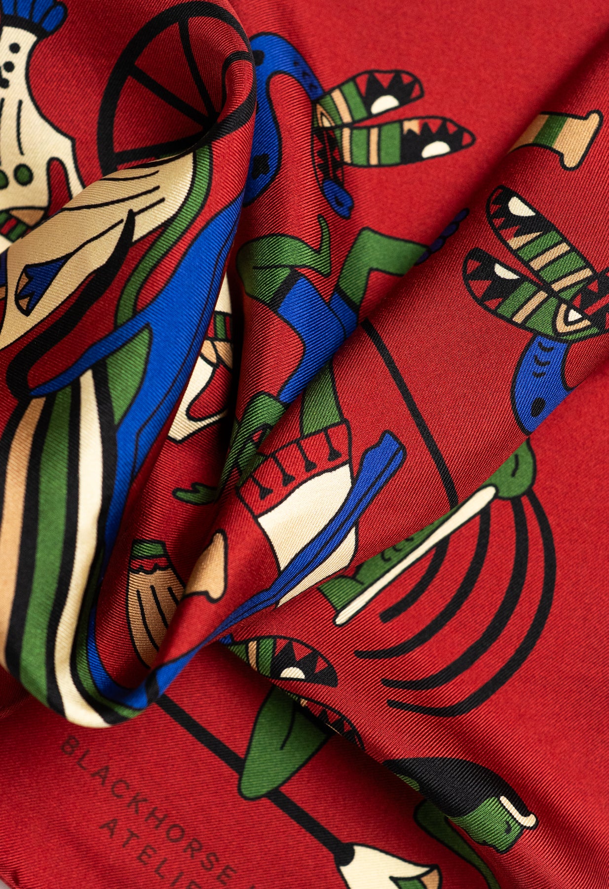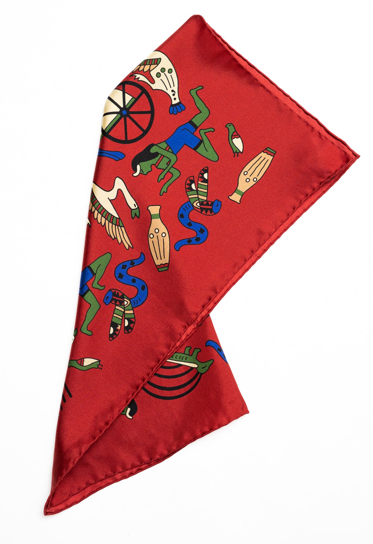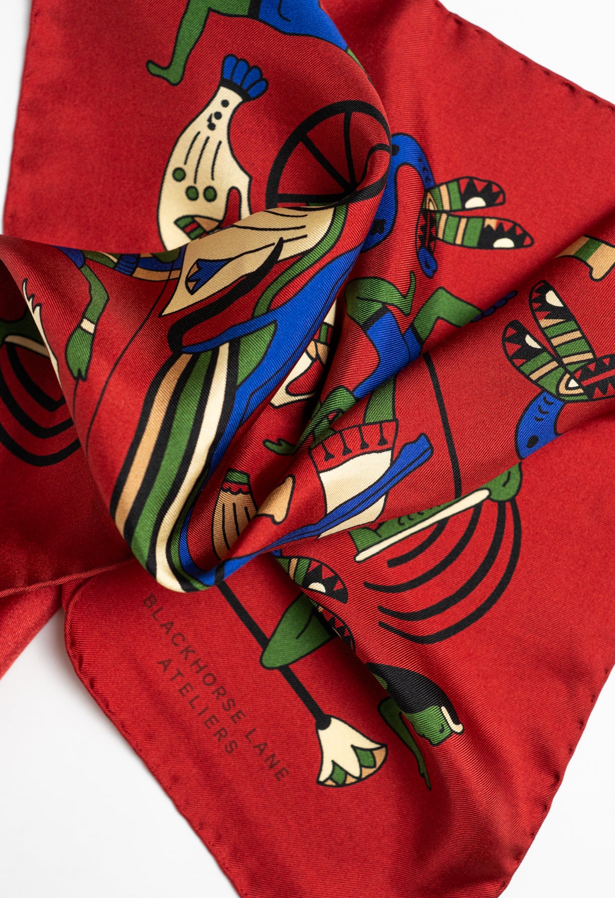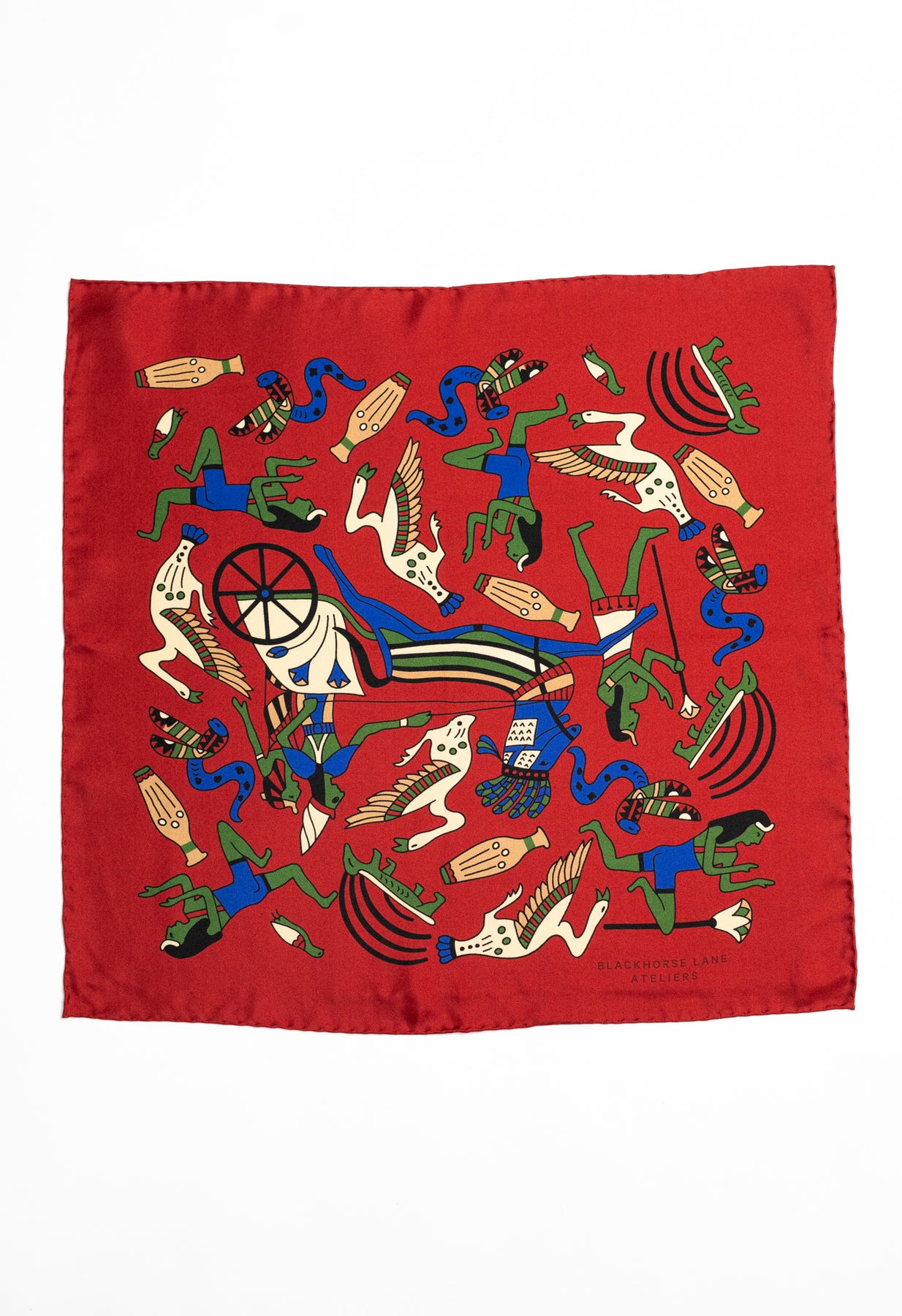 A silk pocket square in rich red, featuring an Egyptian-inspired scene of two pharaohs riding in a chariot, surrounded by animals, attendants, and ceremonial objects. Printed in Macclesfield, England, a town long celebrated for its silk heritage, it combines intricate storytelling with refined craftsmanship. Light yet substantial, it slips effortlessly into a jacket pocket, adding a striking touch of character and sophistication.