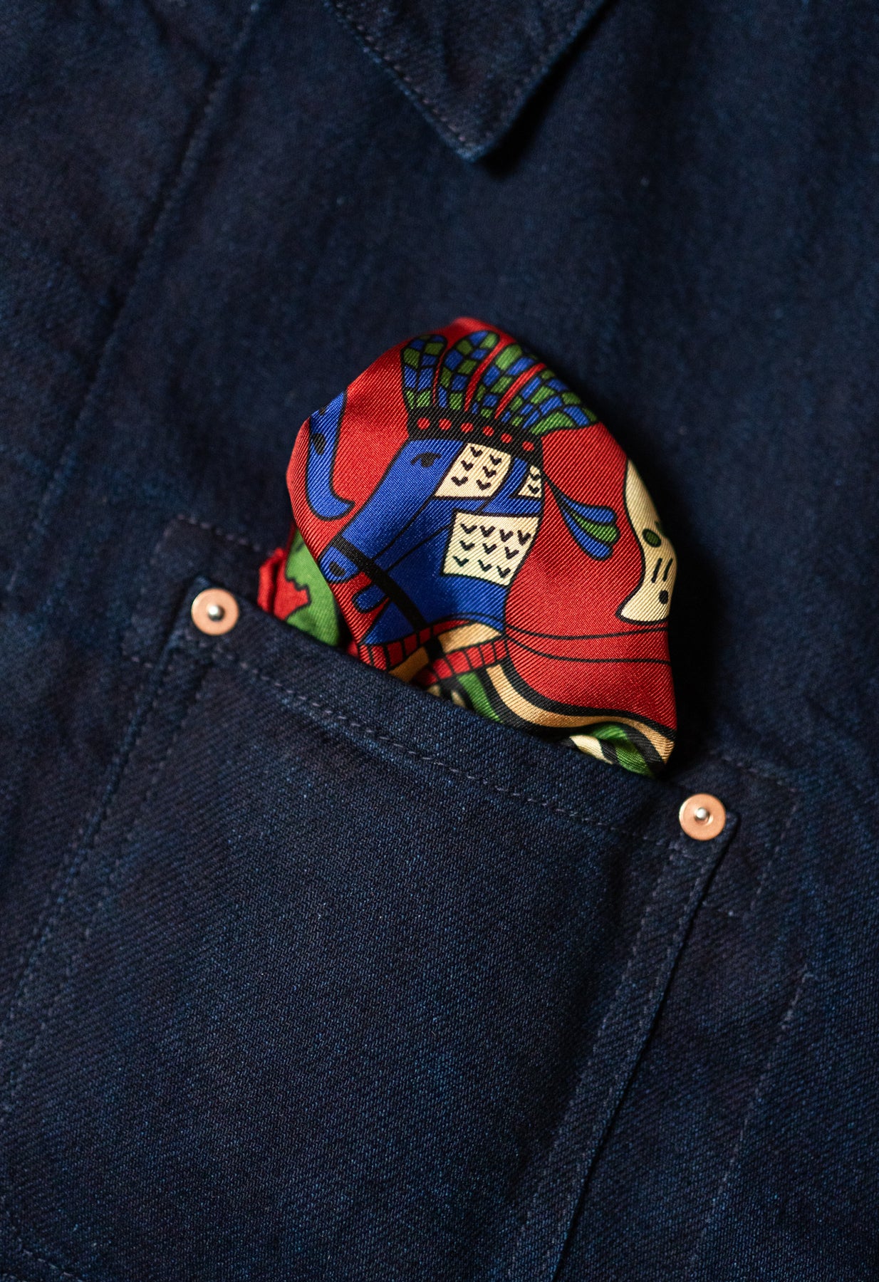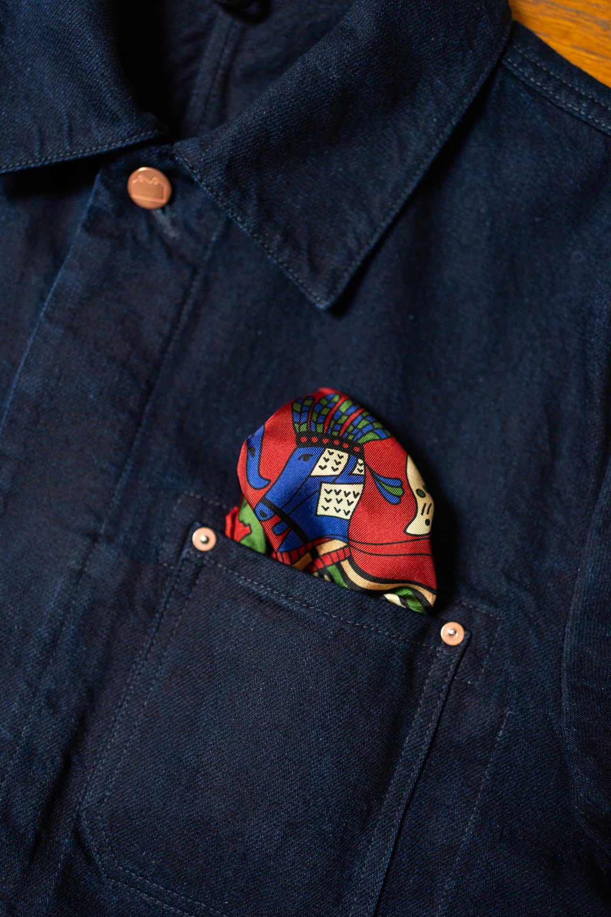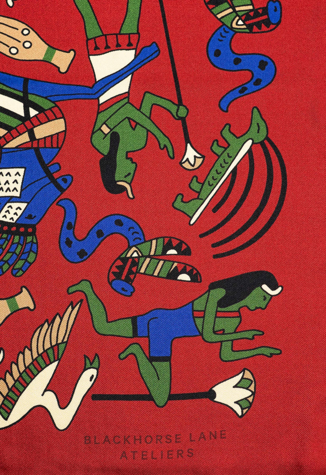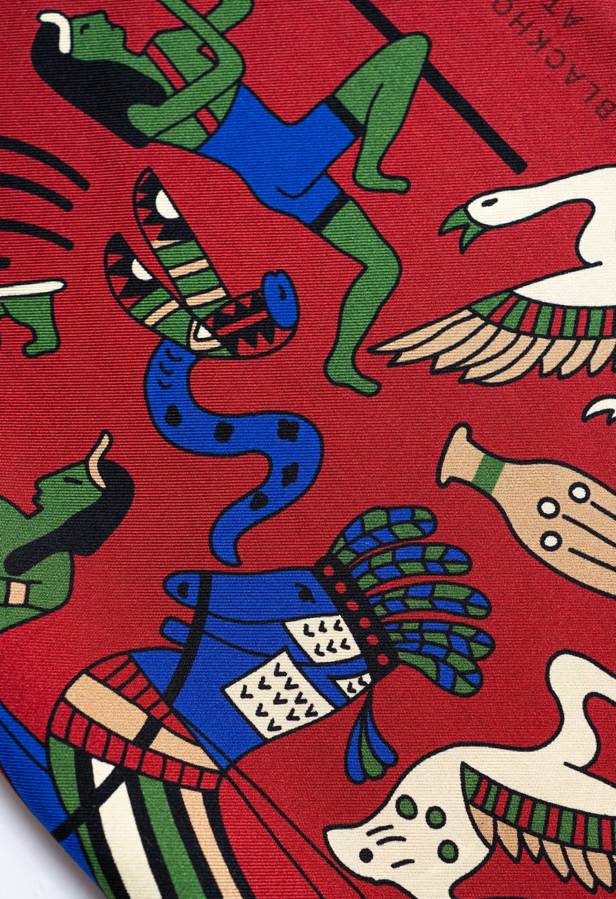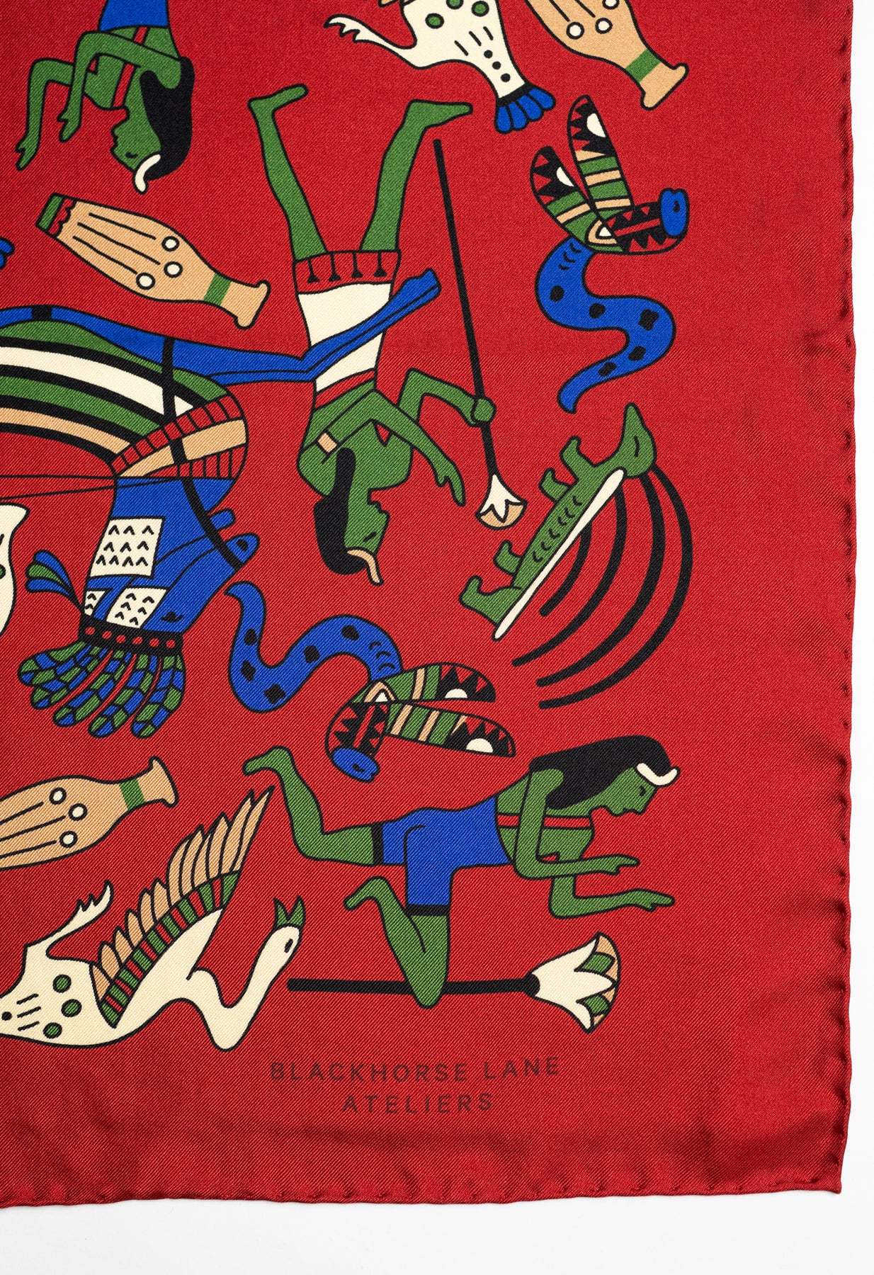 A silk pocket square in rich red, featuring an Egyptian-inspired scene of two pharaohs riding in a chariot, surrounded by animals, attendants, and ceremonial objects. Printed in Macclesfield, England, a town long celebrated for its silk heritage, it combines intricate storytelling with refined craftsmanship. Light yet substantial, it slips effortlessly into a jacket pocket, adding a striking touch of character and sophistication.