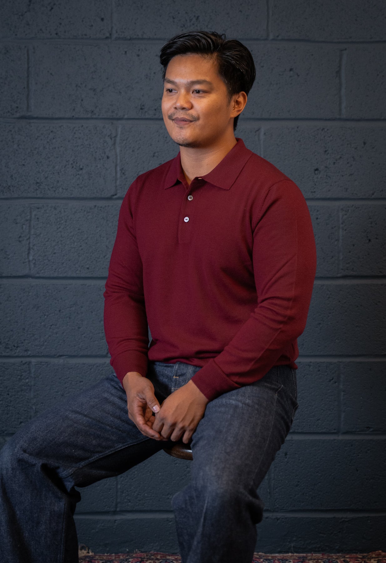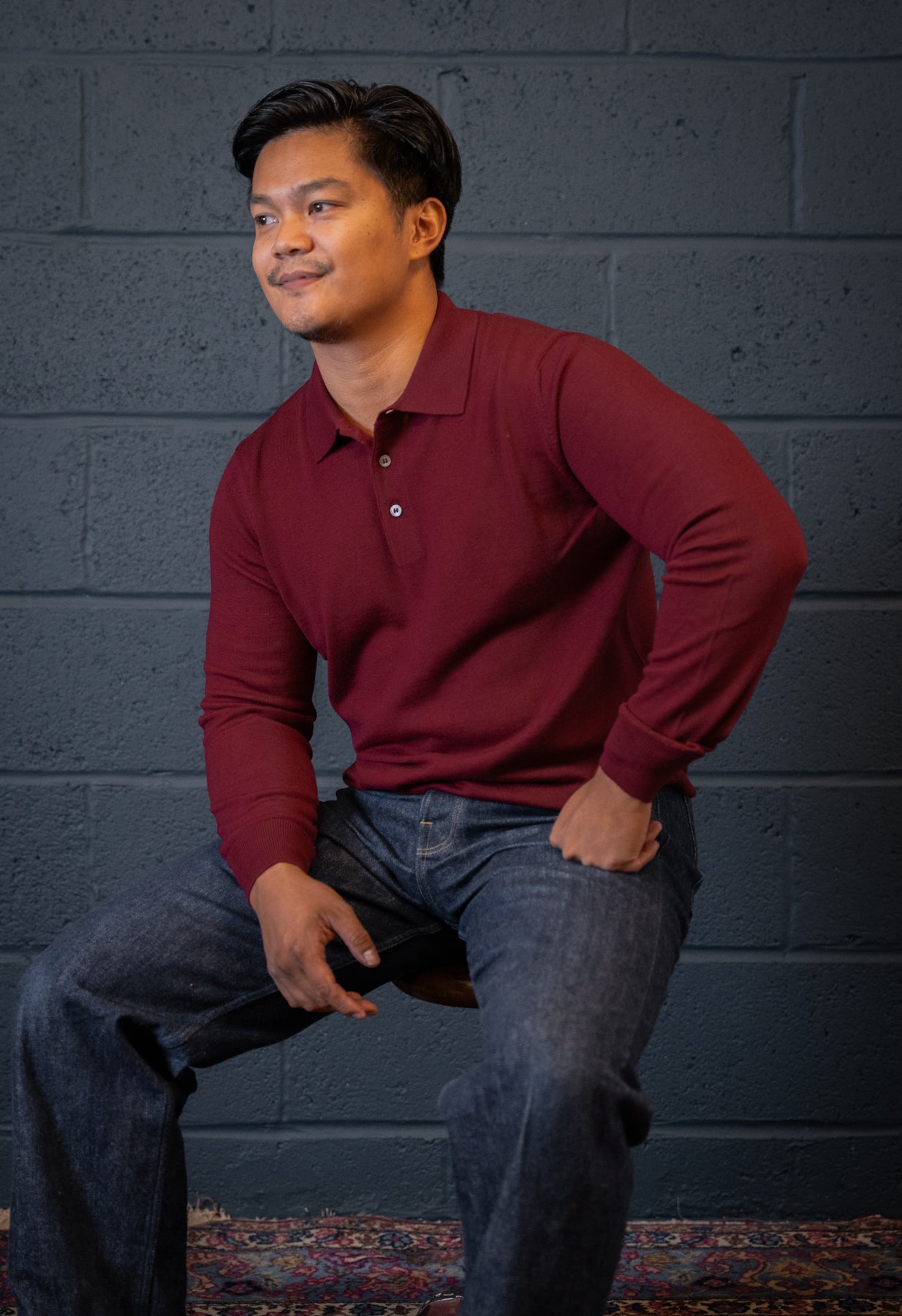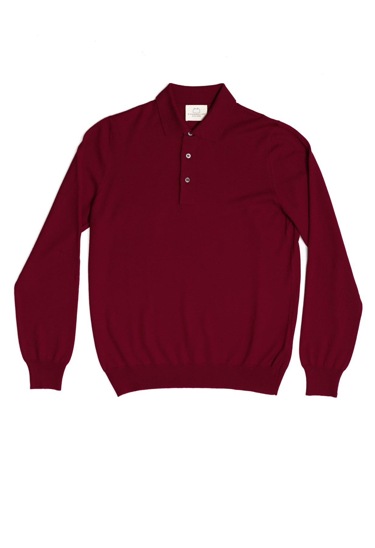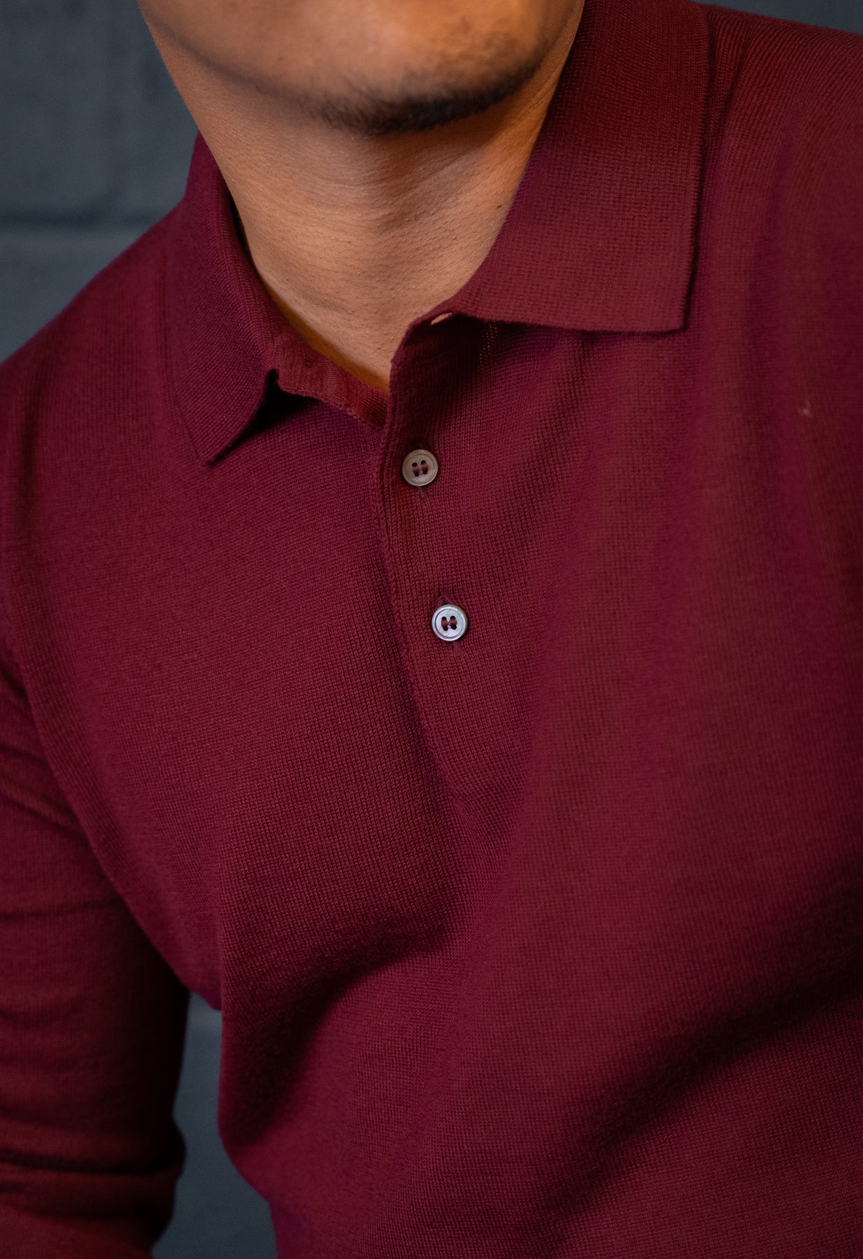 This burgundy polo is crafted from pure, extra-fine merino wool, offering a refined blend of elegance and versatility. With long sleeves and a classic polo collar, it works perfectly layered under a tailored blazer or worn on its own.