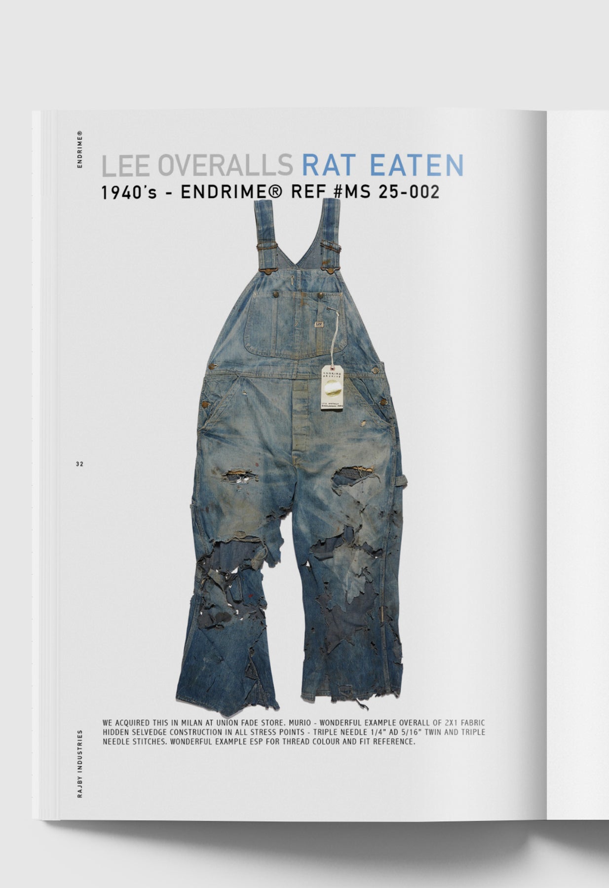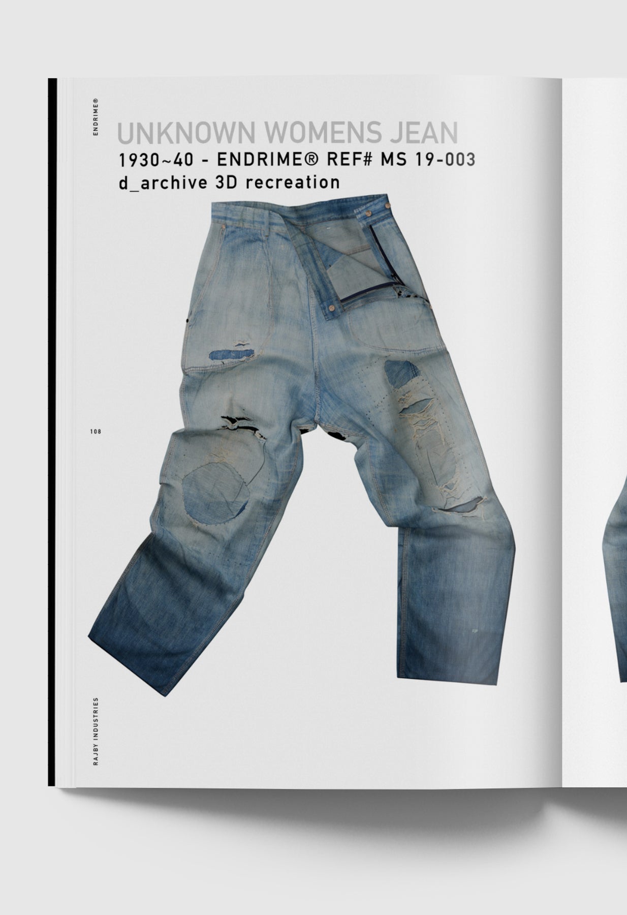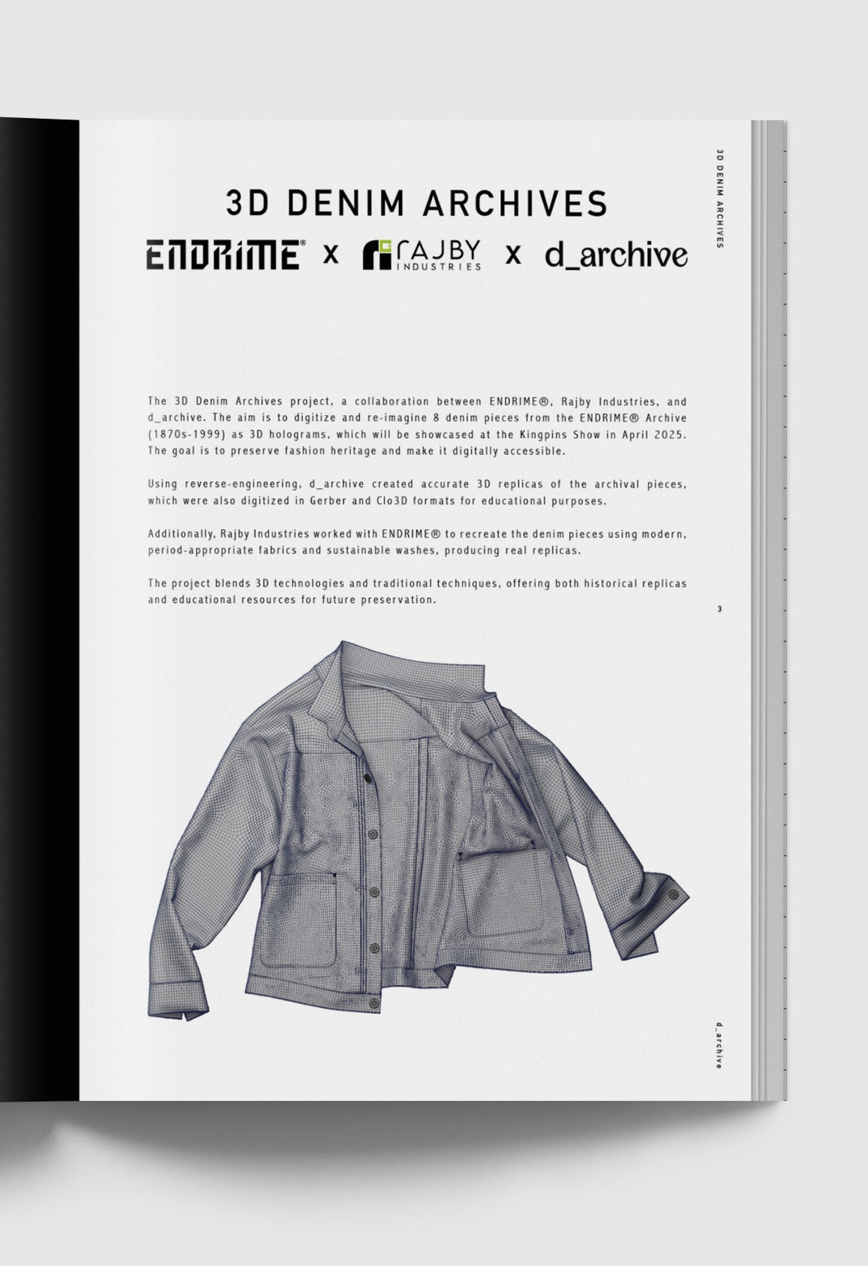 3D DENIM ARCHIVES is a 156-page full-colour publication documenting eight rare denim garments from the ENDRIME® Archive (spanning 1870s–1999). Created in collaboration with Rajby Industries and d_archive, the project combines traditional craftsmanship with digital preservation—each garment has been reverse-engineered, 3D scanned, and recreated using sustainable, period-accurate materials.